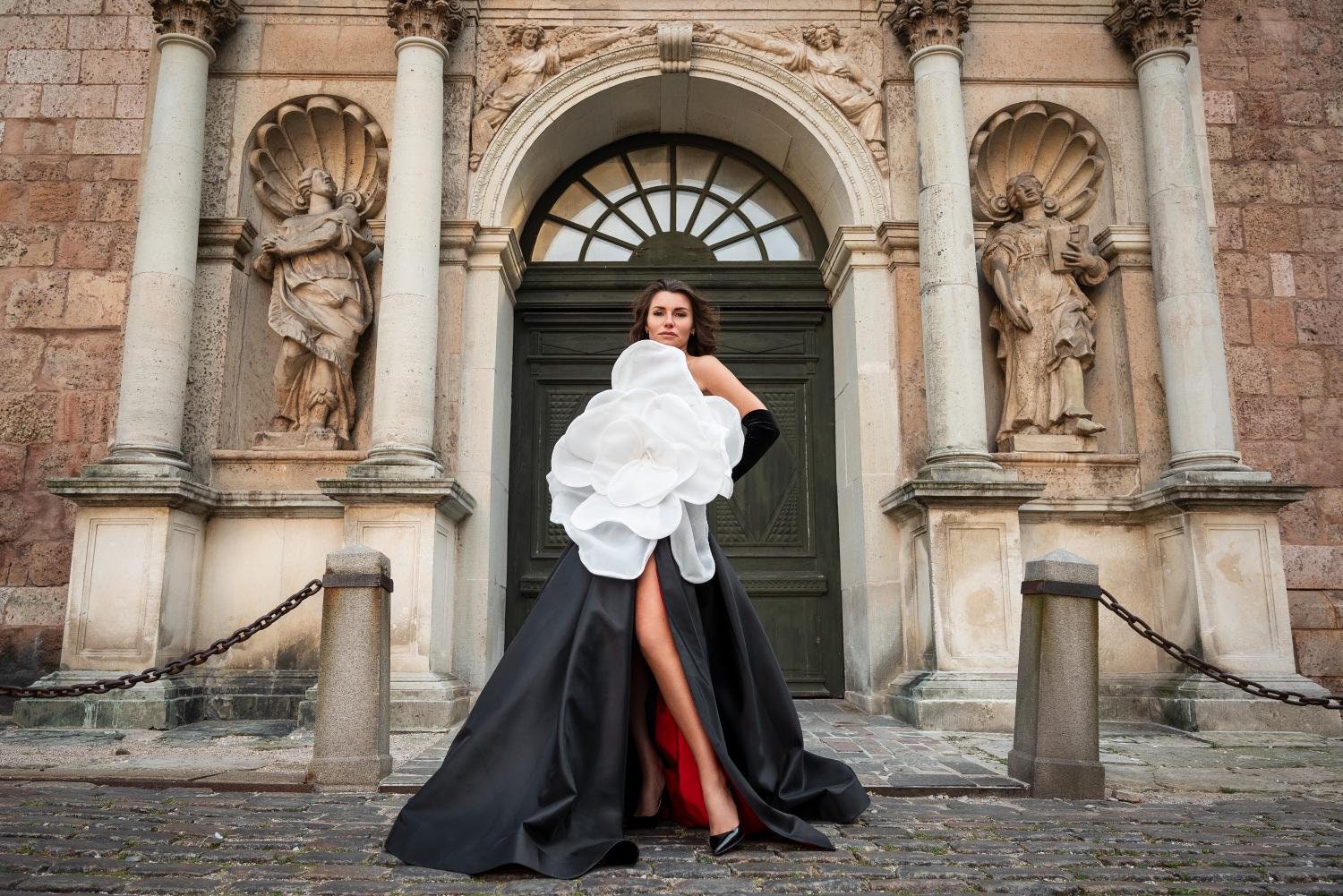 Black maxi fit and flare dress with corset top part and sun cut skirt with high slit. Top part has lace up back. Dress is decorated with big 3D flower that is detachable.